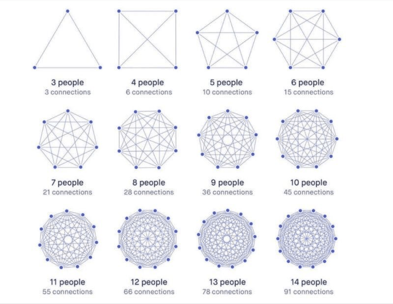 Le schéma ci-dessous illustre bien ce phénomène : au-delà de 14 personnes, la complexité des interactions devient presque indescriptible.