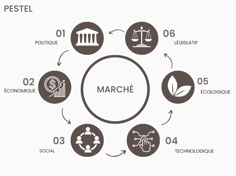 On peut retrouver tous ces facteurs dans l’analyse PESTEL qui s’appuie sur les axes suivants :